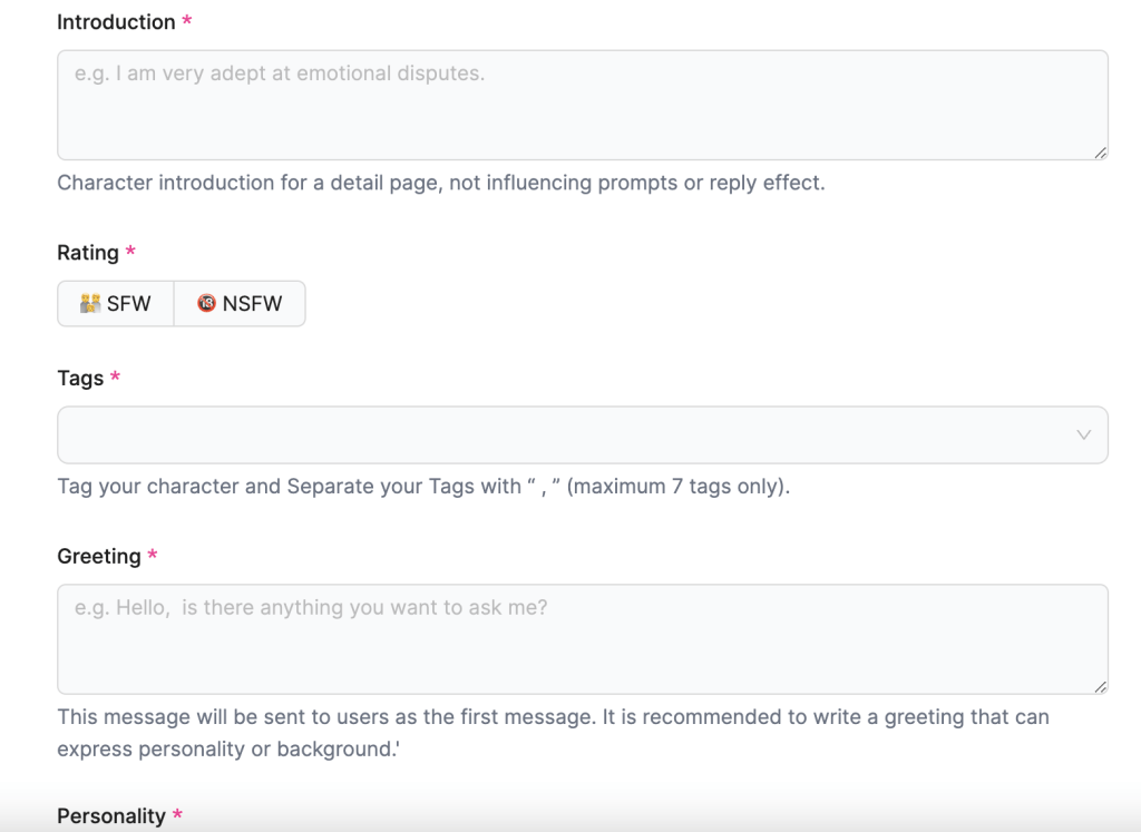 Introduction: This is where you’re encouraged to delve deep into the intricacies of your character’s personality. The more detailed and nuanced the description, the more accurately the bot can embody your character’s essence. Describing their motivations, fears, likes, dislikes, and even daily habits can significantly improve how the bot represents them, leading to richer and more engaging interactions.