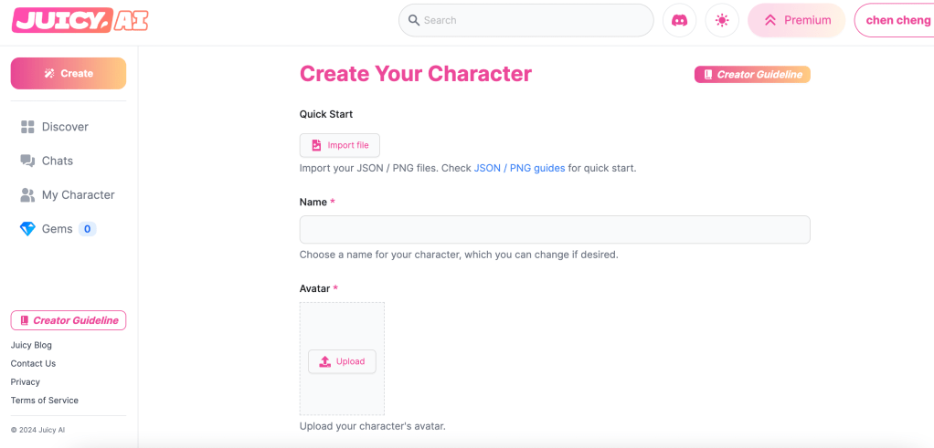 Crafting a character on Juicy AI is an inventive and personalized process. Begin by visiting the Juicy AI homepage, then choose the “create” feature, followed by “create a character.”