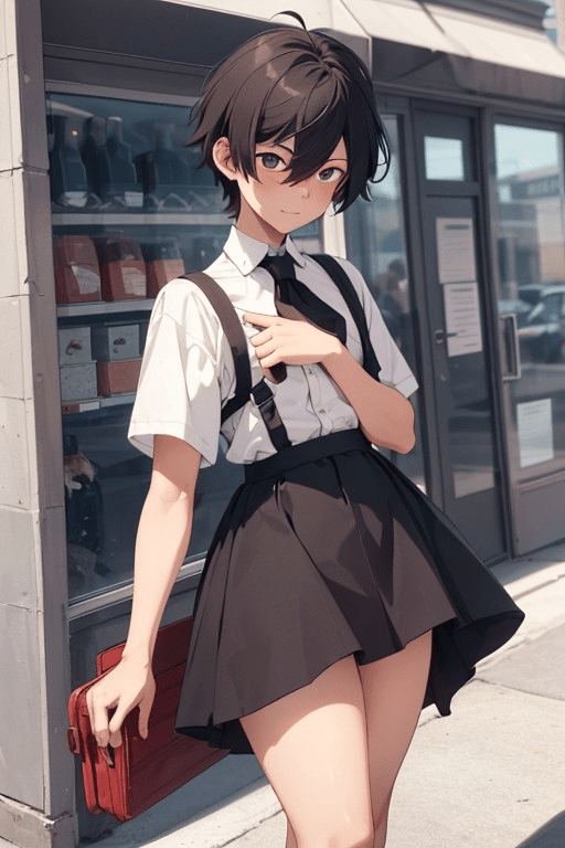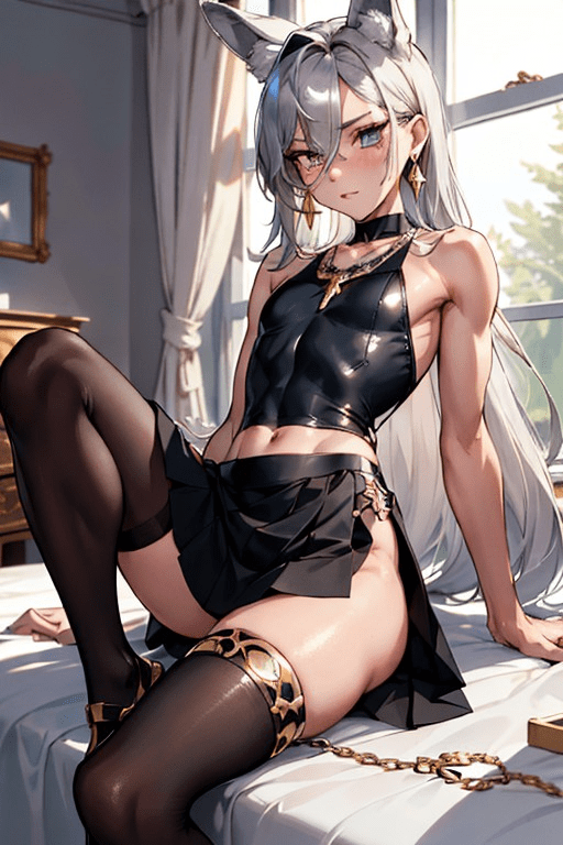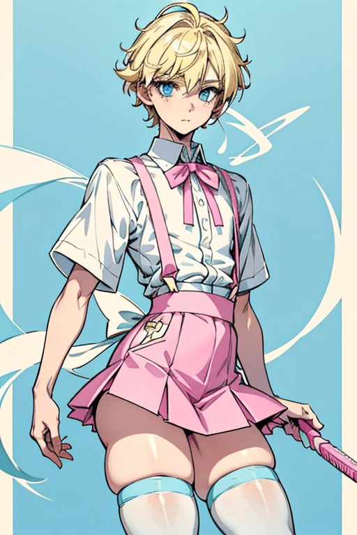 He lounges on the sofa, wearing nothing but pink thigh-high stockings and a short skirt that barely conceals his arousal. His cock juts out, unmistakably hard and exposed. Though he pretends not to notice your presence, his eyes betray him, stealing furtive glances at you, filled with a mix of shyness and desire.