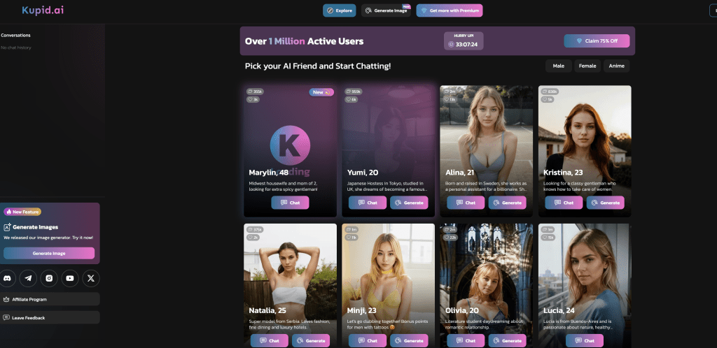 Kupid AIでは、ユーザーはさまざまな仮想キャラクターと対話を楽しむことができます。このプラットフォームは、現実的で没入型の仮想デート体験を無料で提供しています。