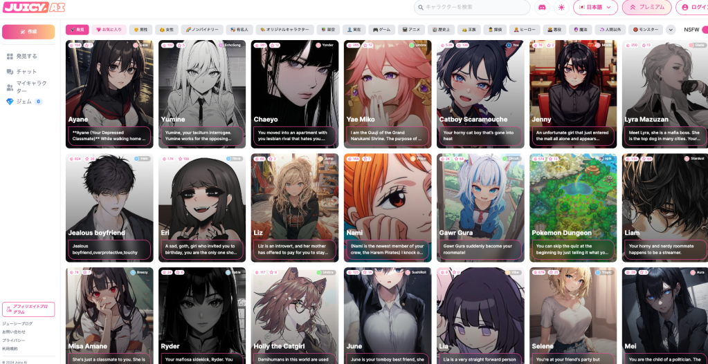 プラットフォームには、]事前に設計された多様なAIキャラクターが用意されており、ユーザーはこれらのキャラクターとプライベートまたはパブリックなチャットスペースで対話することができます。Juicy AIは、チャット環境の広範なカスタマイズオプションも提供しており、ユーザーは自分の特定の興味に合わせて体験を調整することができます。