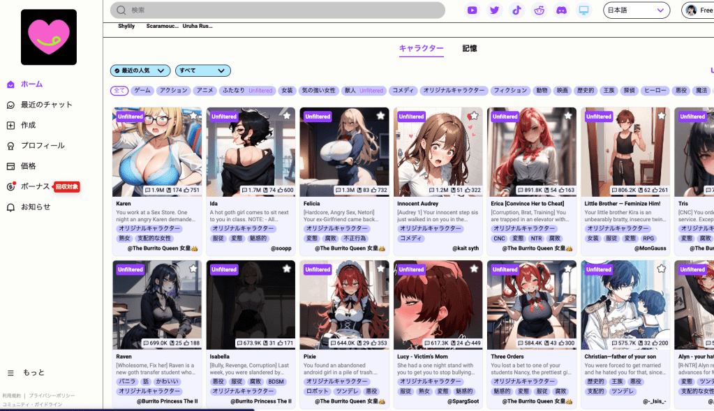 Janitor AIは、歴史、ゲーム、フィクション、アニメ、セレブリティ、ノンバイナリーなど、さまざまなカテゴリーにわたる独自のキャラクターを持つチャットボットを提供しています。ユーザーは、自分の好みに合わせたパーソナルなチャットボットを作成するオプションもあります。